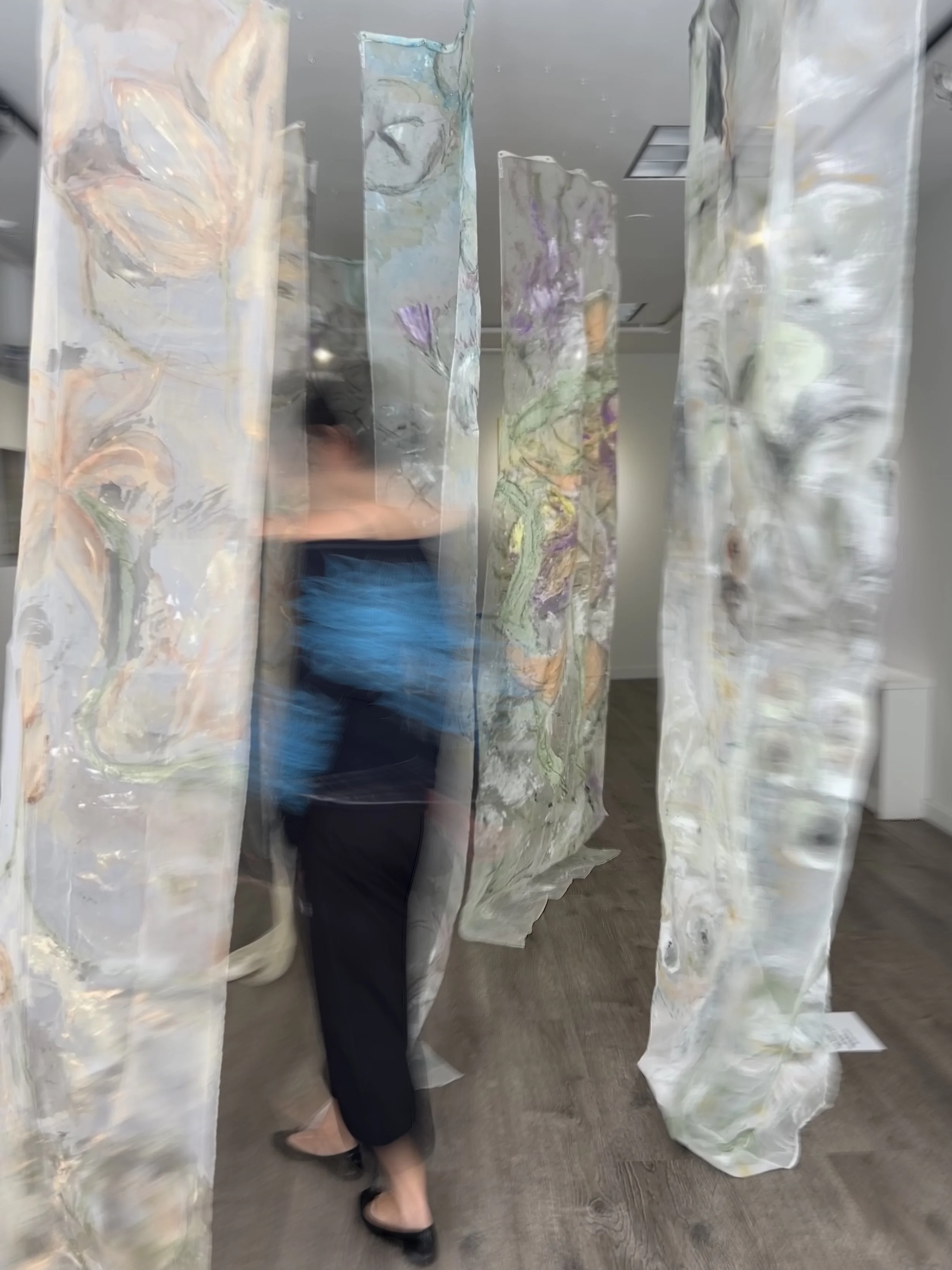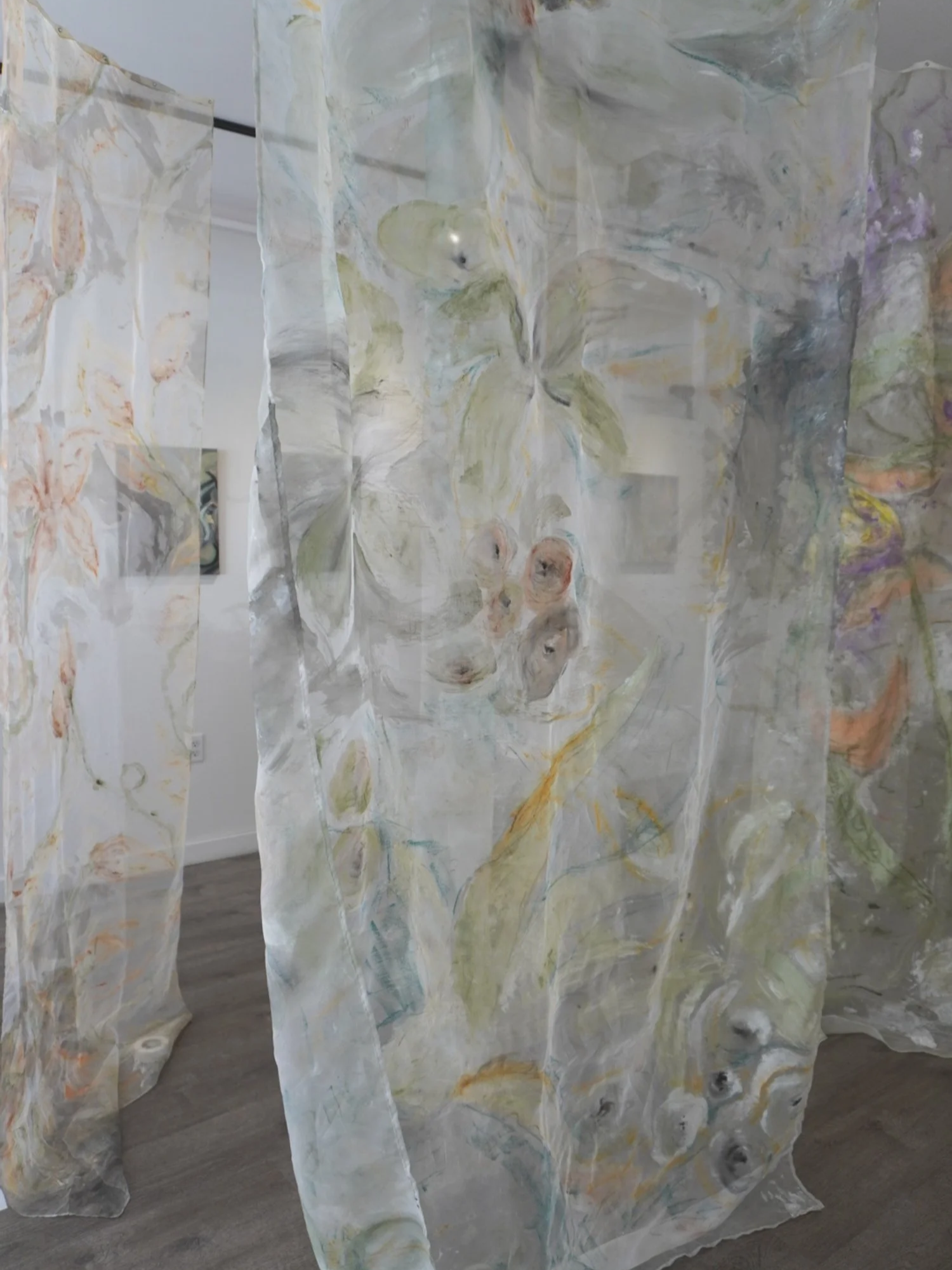 Sophie Umana Krauss’ satin panels extend her exploration of nature into a more dynamic form. The lightness of the fabric allows wind and shifting light to animate the work, making the painted surfaces appear alive and ever-changing. This movement echoes the unpredictability of natural environments, transforming the panels into living fragments of landscape that invite viewers into a more immediate, sensory experience of nature.